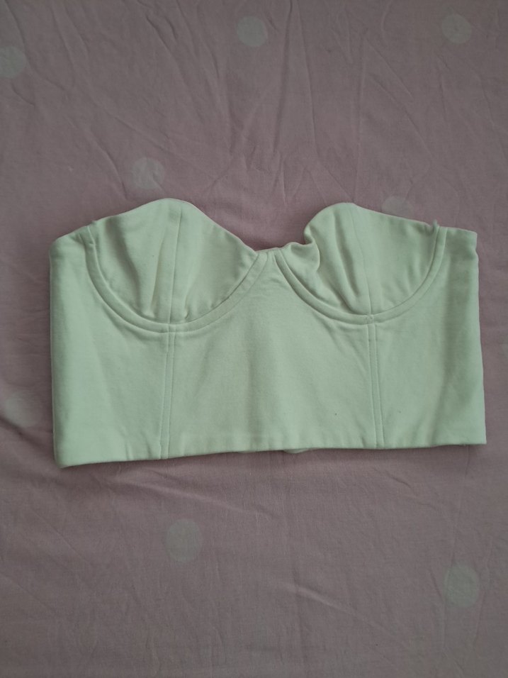 Bej renkli, straplez ve midi boyda, yumuşak sentetik kumaştan yapılmış, sade ve desen içermeyen fitted büstiyer. Günlük sokak stiline uygun.