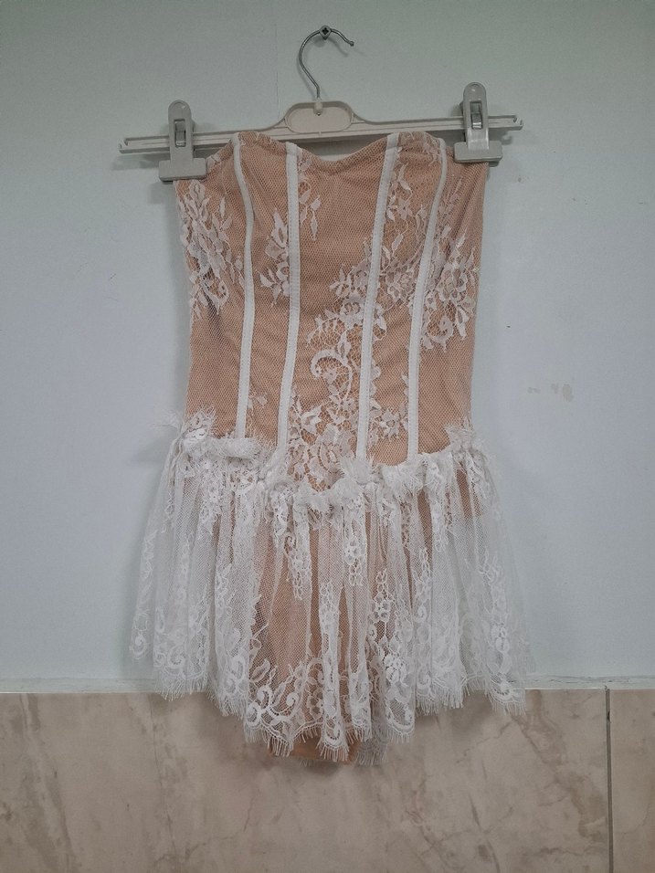 Bej straplez mini elbise bohem tarzda, vücuda oturan kesim ve ince beyaz dantel detaylara sahip. 1 kez giyilmiştir sıfır ayarında sorunsuzdur