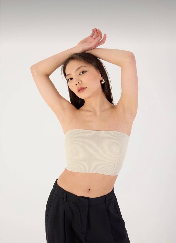 Bej renk, pamuklu kumaştan yapılmış, straplez, vücuda oturan bustiyer. Minimalist ve normcore tarzda, günlük rahat kullanım için uygundur.
