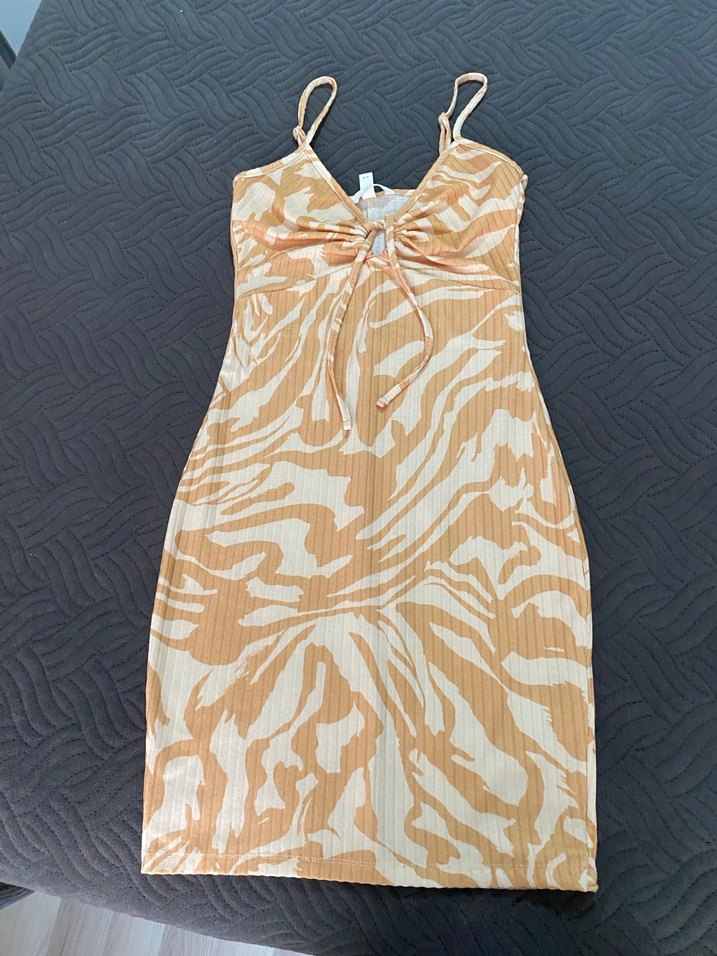 Bej renkli, kolsuz ve straplez mini elbise, bağlama detaylı XS