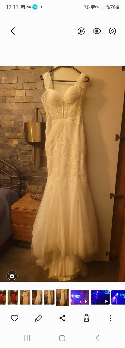 Bej renkli, straplez ve vücuda oturan bu gelinlik, vintage esintili prenses kesim ve modern klasik tarzı ile dikkat çekiyor.
