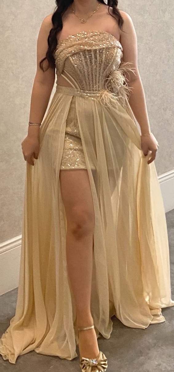 Bej Straplez Uzun Drapeli Alfabeta Parti Elbisesi