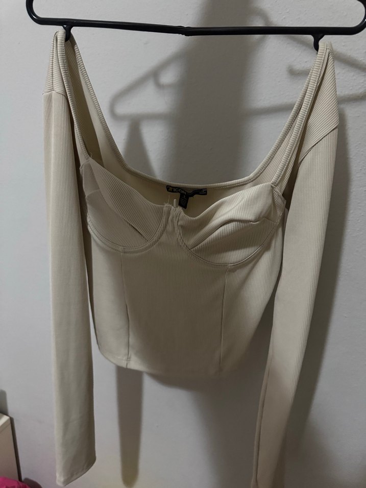 Bej renkli, straplez yaka ve uzun kollu, vücuda oturan kadın bluz. Sentetik kumaştan, minimalist ve günlük kullanıma uygun sokak stili.