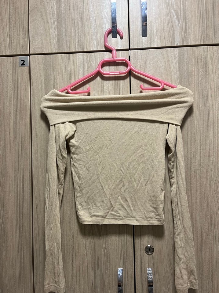 Bej renkli, straplez yakalı ve uzun kollu, vücuda oturan kadın bluz. Düz ve sentetik kumaştan, günlük kullanıma uygun minimal tarzda.