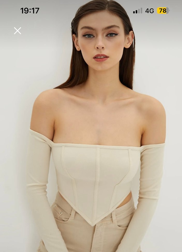 Bej renk, straplez, uzun kollu, kısa kesim ve sentetik kumaştan yapılmış dar kesim bluz. Minimalist ve çağdaş tarzda, günlük kullanım için uygundur.