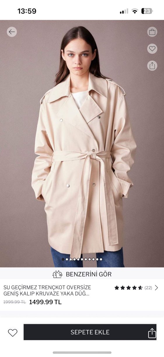 Bej renkli, su geçirmez sentetik kumaştan yapılmış, kemerli ve klasik yaka detaylı midi uzunlukta trençkot. Günlük kullanım için uygundur. Etiketi yok hiç kullanılmadı l beden ama büyük kalıptır