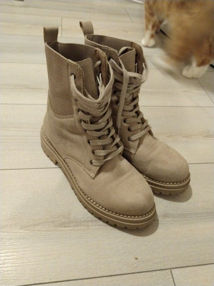 Bej süet malzemeden yapılmış, blok topuklu ve bağcıklı kadın botları. Yumuşak dokusu ve desensiz tasarımıyla günlük kullanıma uygundur. LC Waikiki Marka. çok az kullandım. iyi durumda.