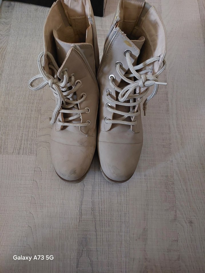 Bej süet malzemeden, bağcıklı ve dolgu topuklu kadın botu. Minimalist ve normcore tarzıyla günlük kullanıma uygundur.