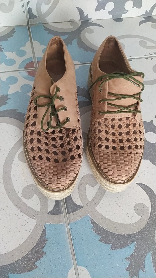 Kadınlar için süet malzemeden yapılmış, bağcıklı ve dolgu topuklu espadril. Nefes alabilen dokuma detaylarıyla günlük kullanıma uygun, bej pastel tonlarında.