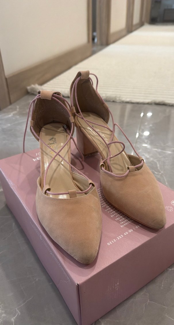 Bej süet, bağcıklı ve blok topuklu kadın ayakkabısı, romantik akşamlar için pastel tonlarda şık tasarım. Alt kısmında ve iç kısmına yara bandı yapıştırmıştım bu sebeple iç kısmında pütürlenmeler gibi şeyler var görsellerde belli edilmişmiştir herhangi bir deformemesi yoktur