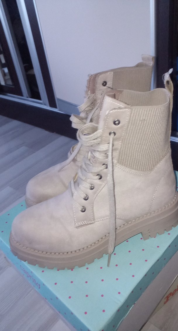 Bej süet, bağcıklı platform topuklu botlar, yumuşak ribanalı bilek kısmı ile rahat bir kullanım sunar, günlük kullanım için uygundur.