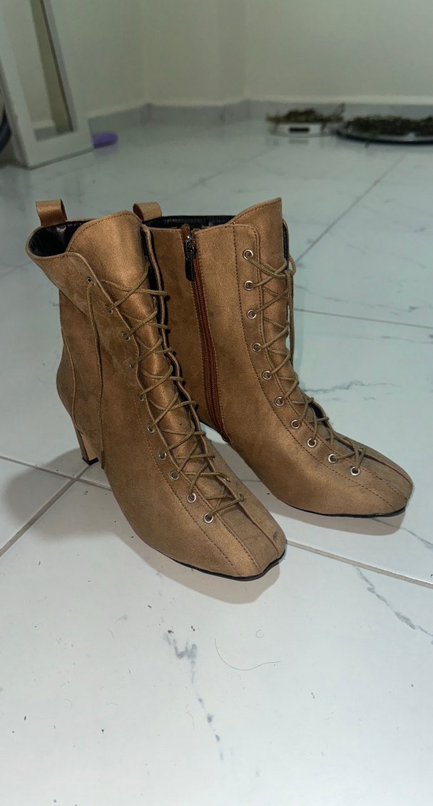 Bej süet kadın botları, stiletto topuk ve bağcıklı tasarımıyla vintage ve şık bir görünüm sunar, günlük kullanım için uygundur.