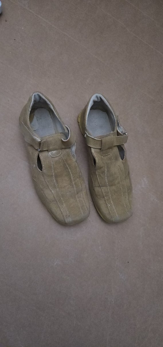 Bej süet malzemeden yapılmış, tokalı bayan sandalet. Minimalist tarzda, günlük sokak giyimine uygun, desensiz ve rahat.