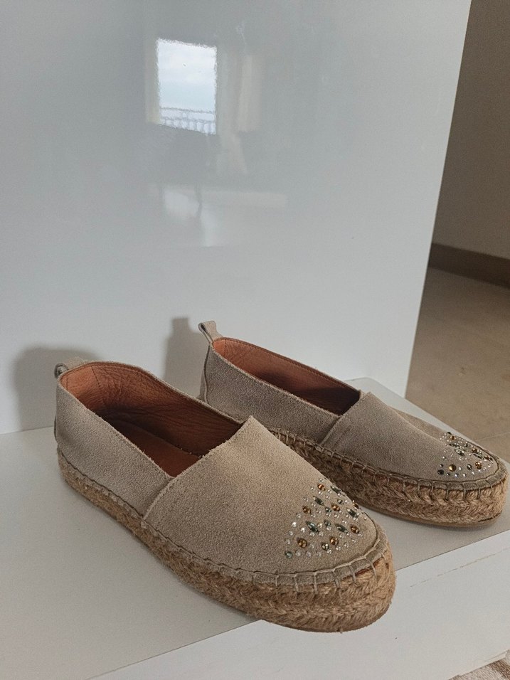 Bej süet espadril, dolgu topuklu, boncuk ve işlemeli detaylara sahip. Minimalist ve bohem tarz için günlük kullanıma uygun.