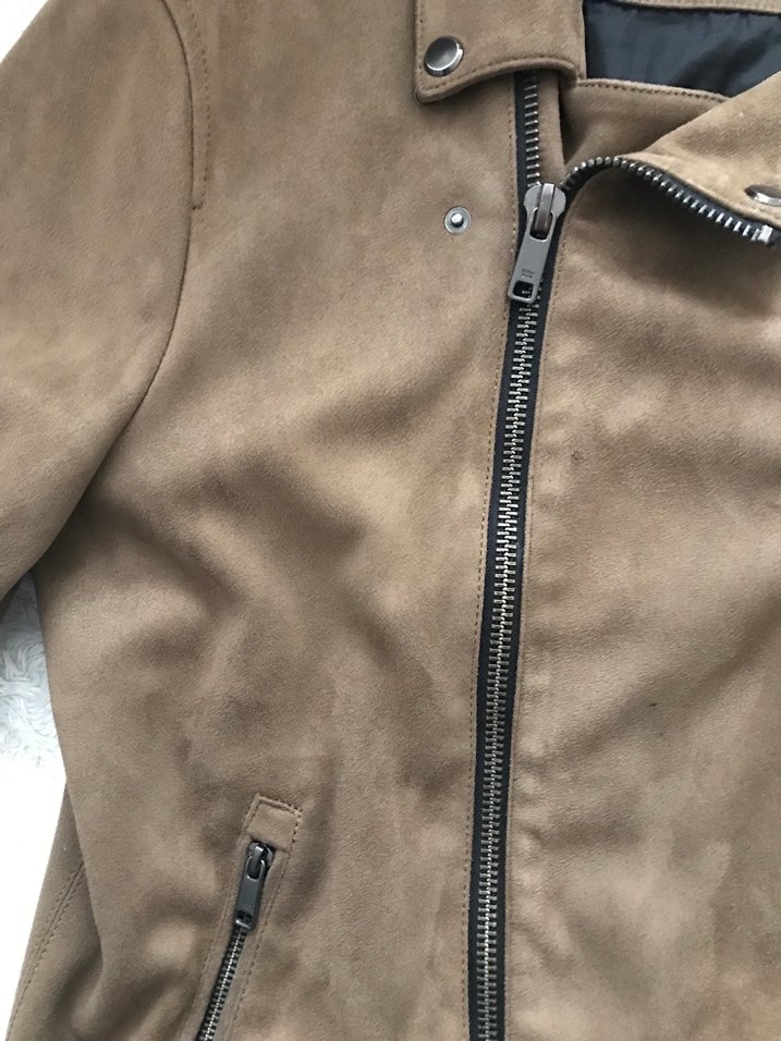 Bej süet, fermuarlı, yakası kesik biker tarzı Sade, ince kesim ve günlük kullanım için uygun.