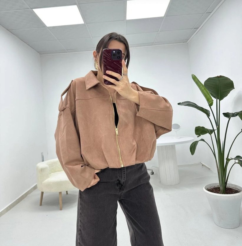 Bej renkte, süet kumaştan, uzun kollu, mini kısa kesim kadın süet ceket. Straplez yakaya sahip, günlük sokak stili için uygun.
