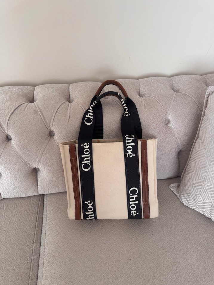 Bej süet malzemeden, baskılı detaylı ve tokalı askılı Chloé marka çanta, günlük sokak stiline uygun.