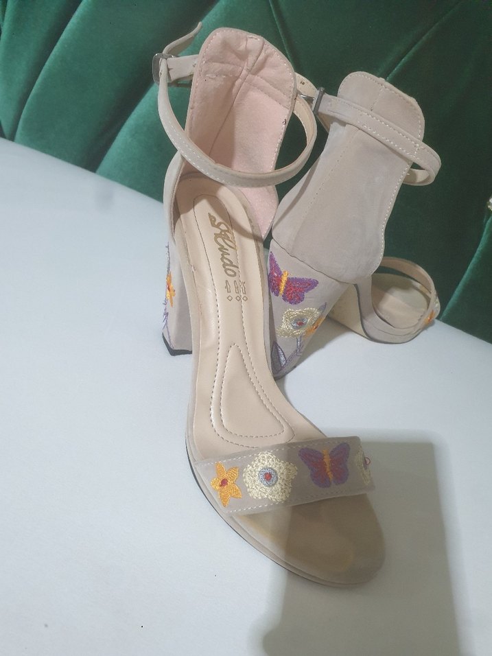 Bej Süet Çiçekli Bohem Topuklu Kadın Ayakkabı