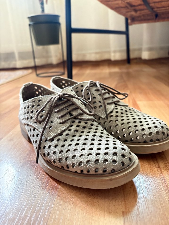 Bej süet malzemeden yapılmış, dolgu topuklu kadın ayakkabısı.Delikli deseni ve güncel tarzıyla sokak stiline uyum sağlar.