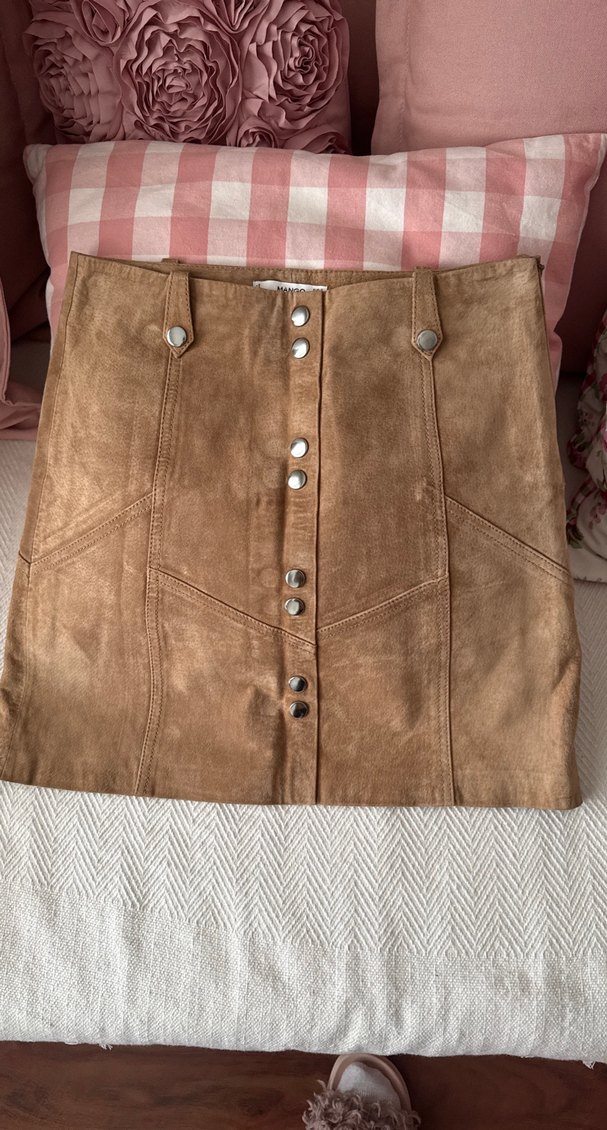 Bej renkli süet deri dokulu, düğmeli ve vücuda oturan mini etek. Parlak görünüme sahip bohem tarzda, günlük kullanım için uygundur.