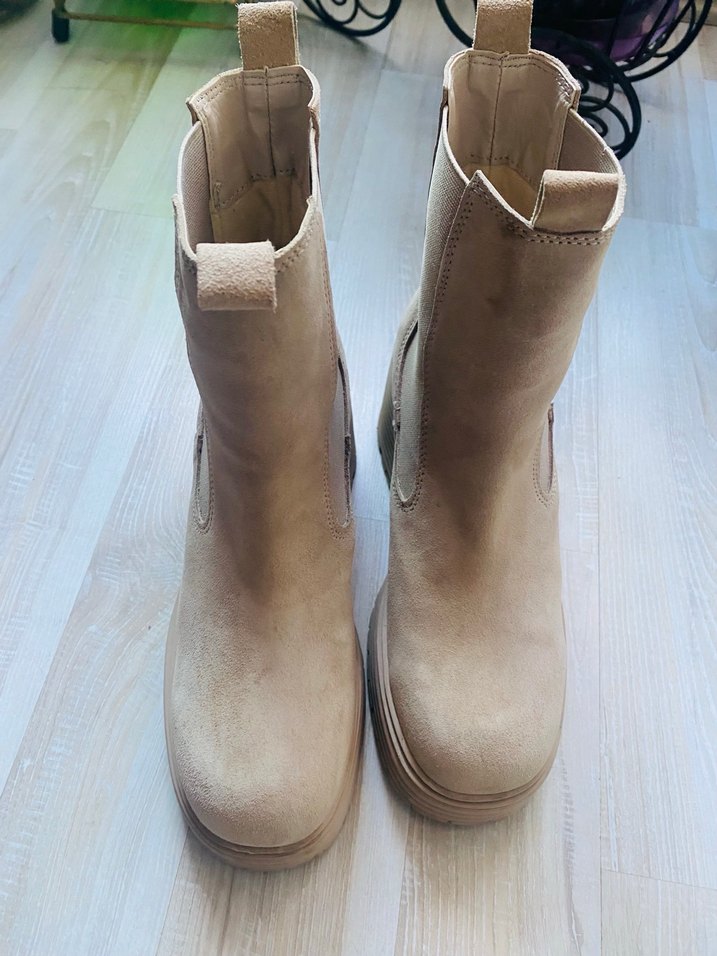 Bej Süet deri Kadın Bot, Kalın Topuklu Elle