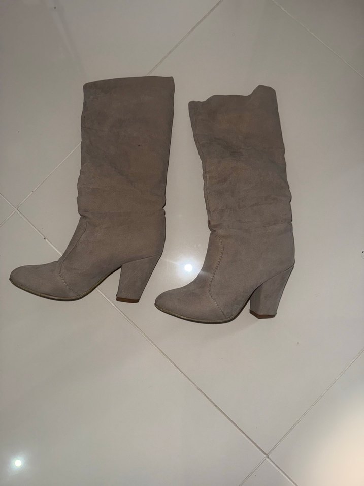 Bej süet diz altı buruşuk çizme, günlük kullanıma uygun rahattır. Desensiz, zahmetsiz şıklık sunar.