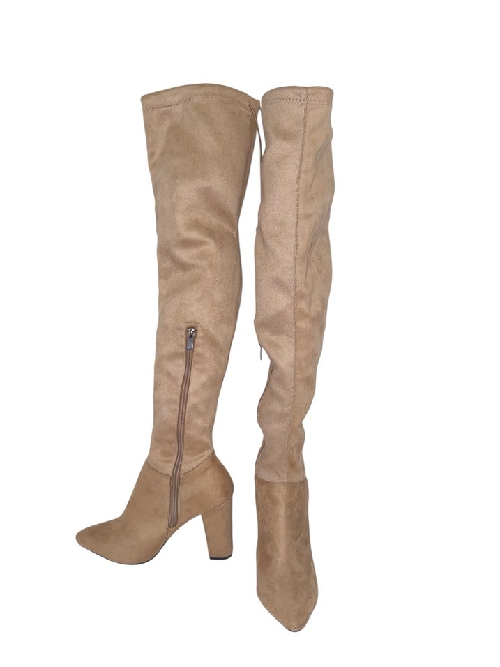 Yumuşak süetten yapılmış, bej renkte dizüstü kadın botları. İnce topuklu ve yan fermuarlı, rahat günlük kullanım için uygundur.