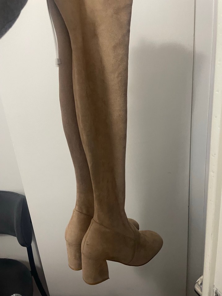 Bej süet dizüstü çizme, stilettolu topuk ve minimalist, çağdaş tarz sunar. Günlük görünümlere zahmetsiz şıklık katar. Görseli uzaktan olan renk daha keni rengi duruyor yakından açık durdu renk . Marka temsili. Ufak tefek sıkıntıları ekledim . Emin degilseniz lütfen almayın iade kabul etmiyorum