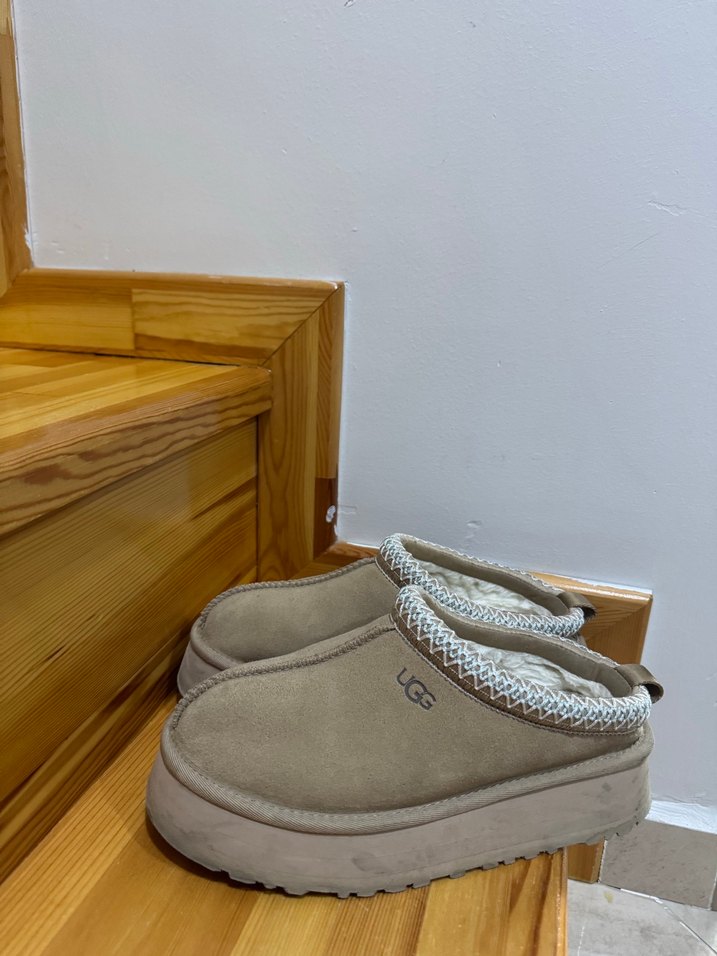 Bej süet malzemeden dolgu topuklu, tokalı ve desen içermeyen kadın ev terliği, günlük kullanım için uygundur. Orjinal amerikadan aldım 4 5 kez giydim