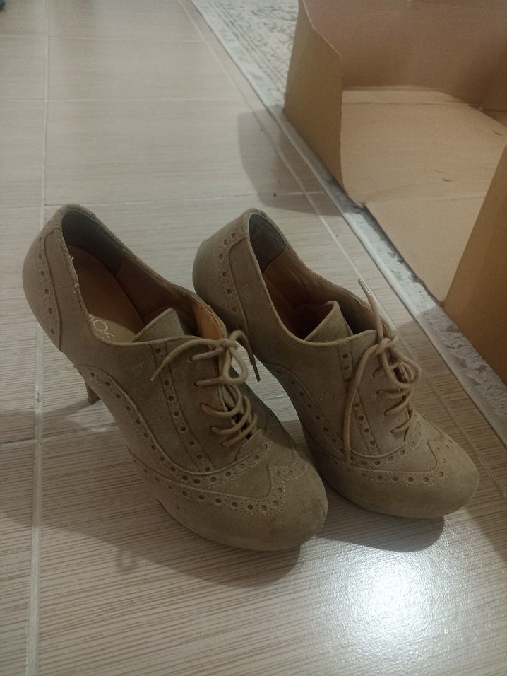 Bej süet malzemeden yapılmış, dolgu topuklu, desen içermeyen kadın klasik ayakkabısı. Ofis için rahat ve şık bir seçenek. 39numara