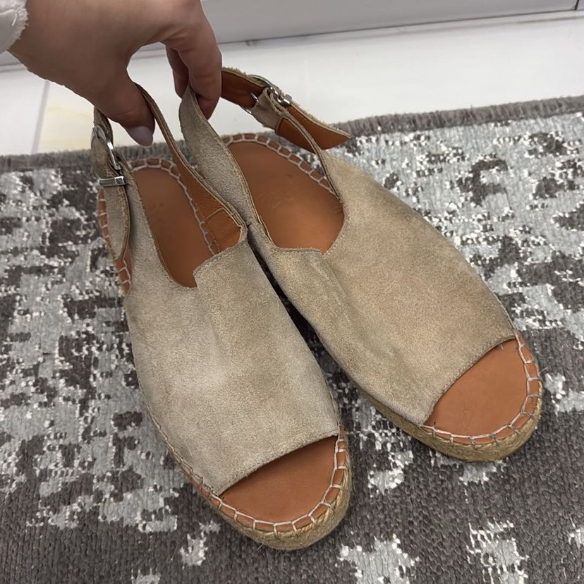 Bej süet dolgu topuklu sandaletler, yılan desenli ve tokalı kayışlı, günlük kullanıma uygun rahat bohem tarzda.
