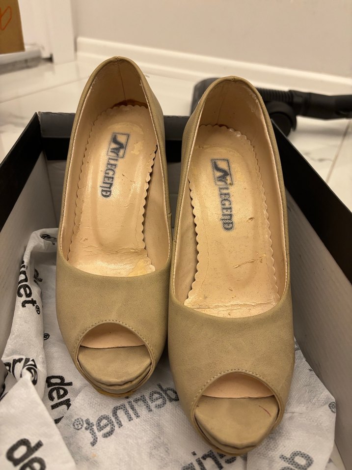 Bej süet dolgu topuklu kadın ayakkabı. Klasik, desen içermeyen ve parlak görünümlü. Günlük kullanıma uygun, tokalı detaylı.
