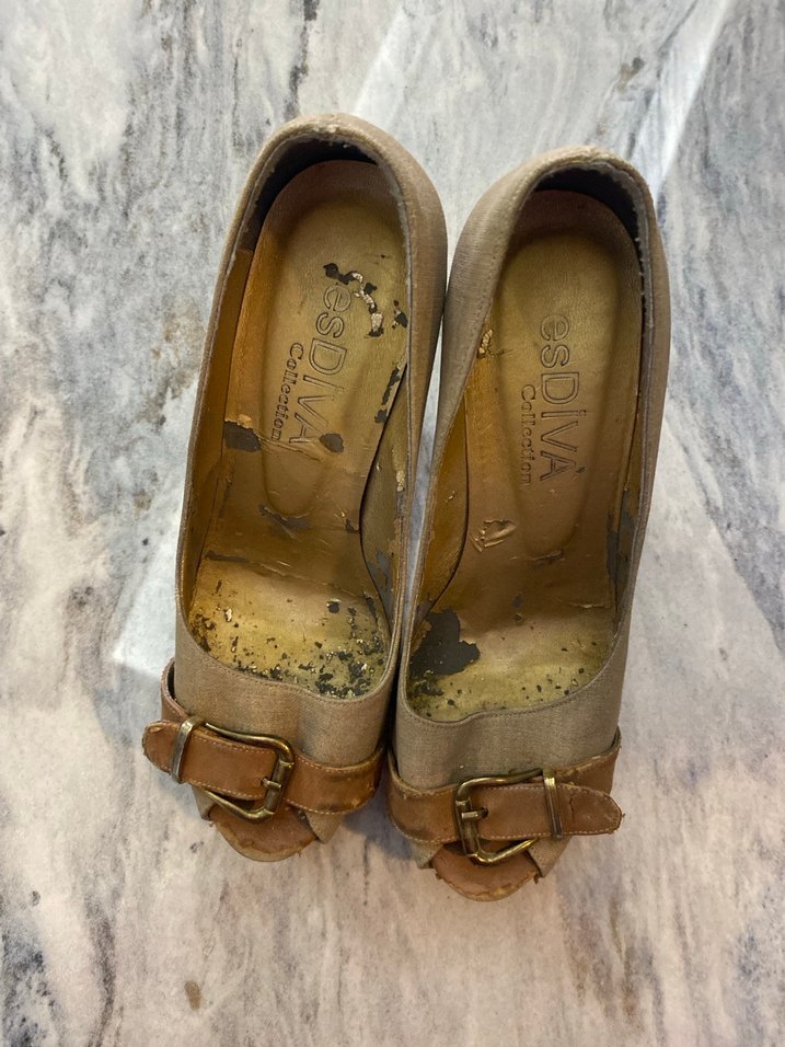 Bej süet malzemeden yapılmış, toka detaylı, vintage tarzda, düz desensiz kadın dolgu topuklu ayakkabılar.