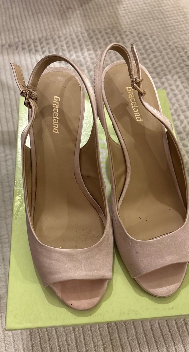 Graceland markalı, tokalı bej süet dolgu topuklu kadın ayakkabı. Düğün ve bohem tarz için uygun, pastel tonlarda ve desensiz.