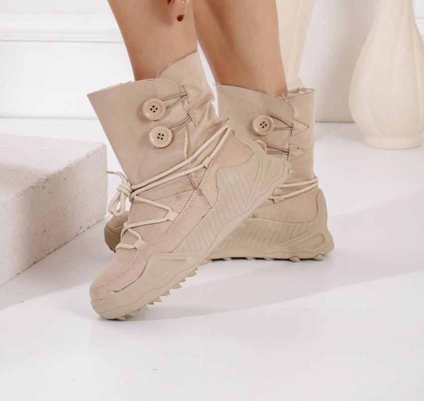 Bej süet malzemeden yapılmış, dolgu topuklu ve düğmeli detaylı kadın botu. Rahat ve şık, günlük kullanıma uygun.
