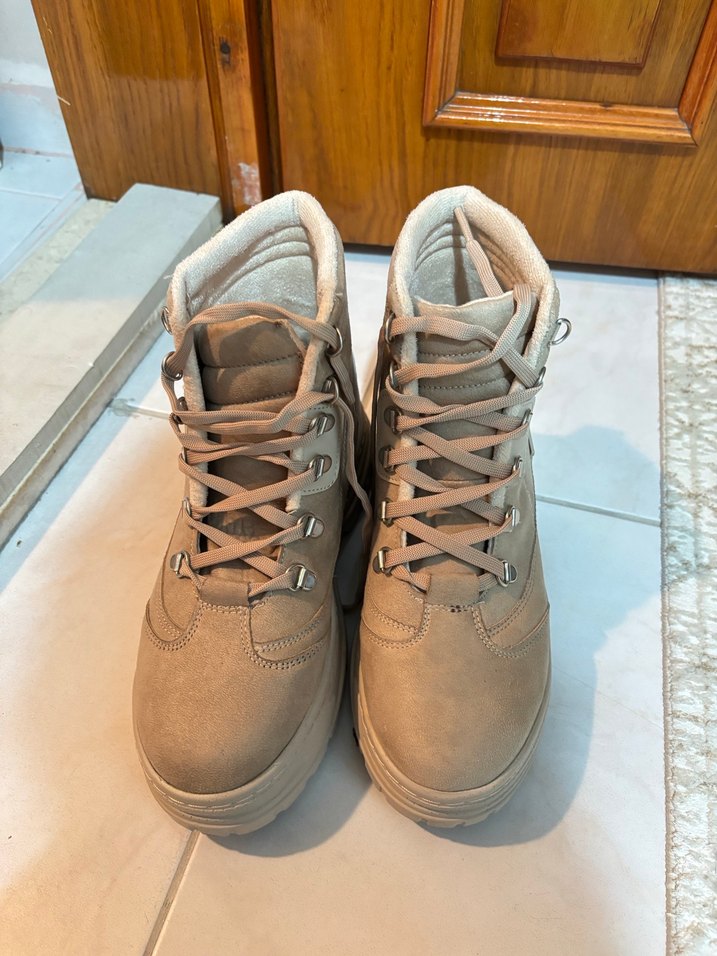 Bej süet malzemeden yapılmış, dolgu topuklu kadın botları. Minimalist, desensiz ve günlük kullanıma uygun şık tasarım.
