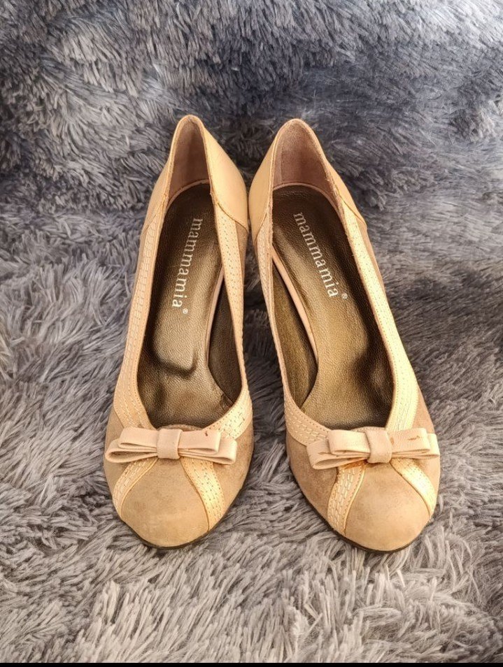 pazarlık payı vardır vintage topuklu topuk boyu 8 cm deri-nubuk karışımı Bej- krem/kahve renklerinde, fiyonk süslemeli, ofis için uygun klasik ve normcore tarzda.