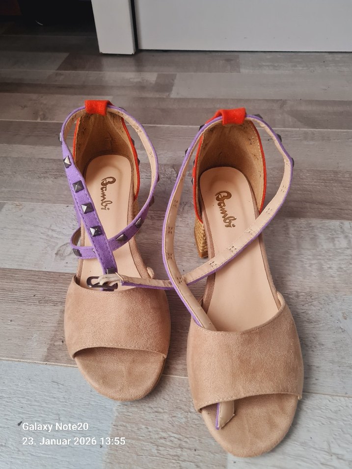 Bej süet dolgu topuklu kadın sandalet, tokalı bantlarla. Bohem tarzda, günlük sokak kullanımı için uygundur.