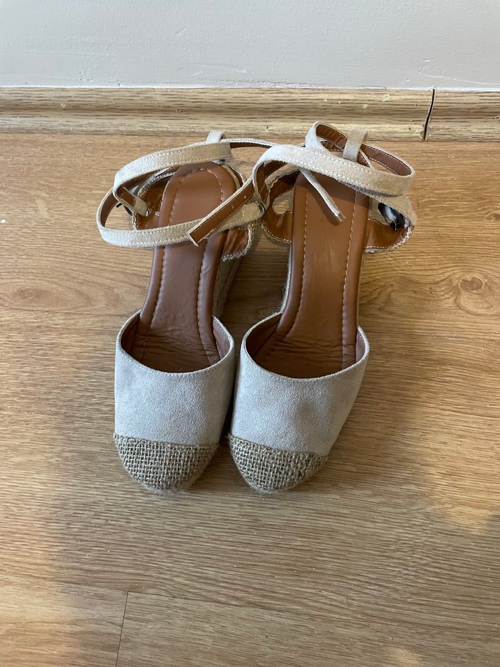 Bej süet dolgu topuklu sandaletler, tokalı kayışlı ve minimalist bohem tarzda, günlük rahat kullanım için uygundur. Burun kısmında dokulu detay bulunur.