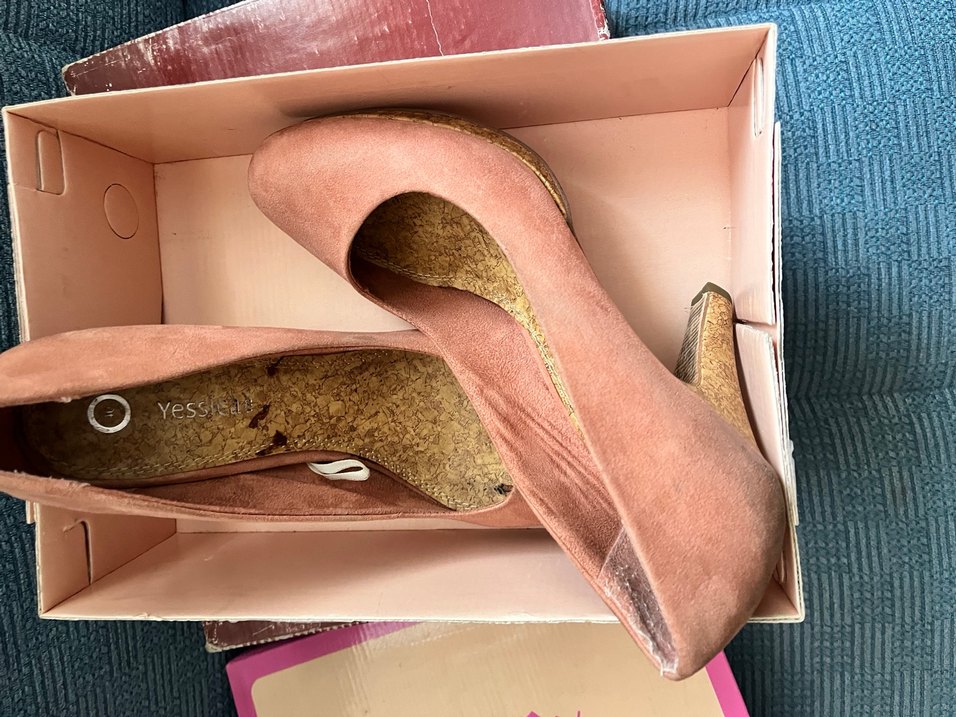 Pembe süet dış yüzeyi, platform topuklu tasarımıyla kadın stilettosu. Mantar görünümlü iç taban sunar. Davetlere ve günlük kullanıma uygundur. Sadece 1 kere nişanda giyildi uzun süredir kutusunda duran bir ürün