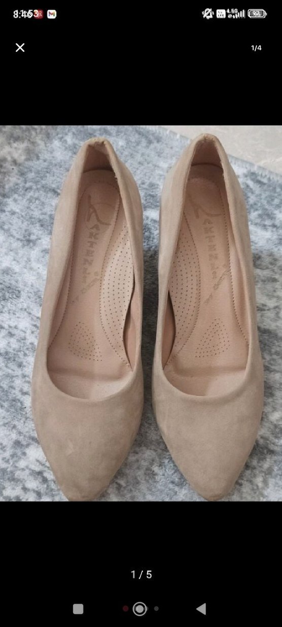 Bej süet malzemeden yapılmış, dolgu topuklu stiletto ayakkabılar, desen içermeyen minimalist tasarımıyla günlük kullanıma uygun şık bir seçenek sunar. burun kısmında çok az bir soyulma var önden ve üstten bakınca belki belirsiz kullanıma engel değil fotoğraflarda ekledim 35 numara
