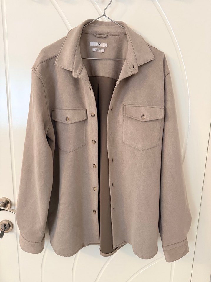Bej süet kumaştan, düğmeli, notalı yaka ve uzun kollu Salaş kesim, midi boy, günlük rahat kullanıma uygun. Minimalist sokak stili.