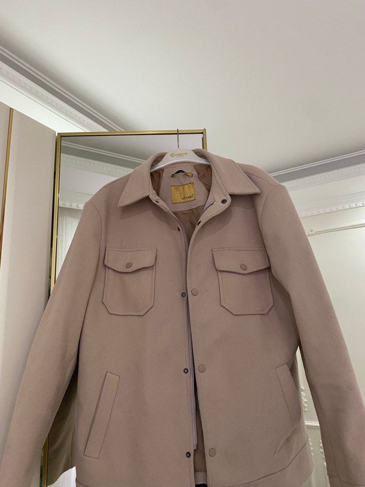 Bej renkli süet kumaştan üretilmiş, düğmeli erkek ceket. Normal uzunlukta, uzun kollu ve regular fit kesime sahip, günlük sokak stili için uygun minimal tasarım.