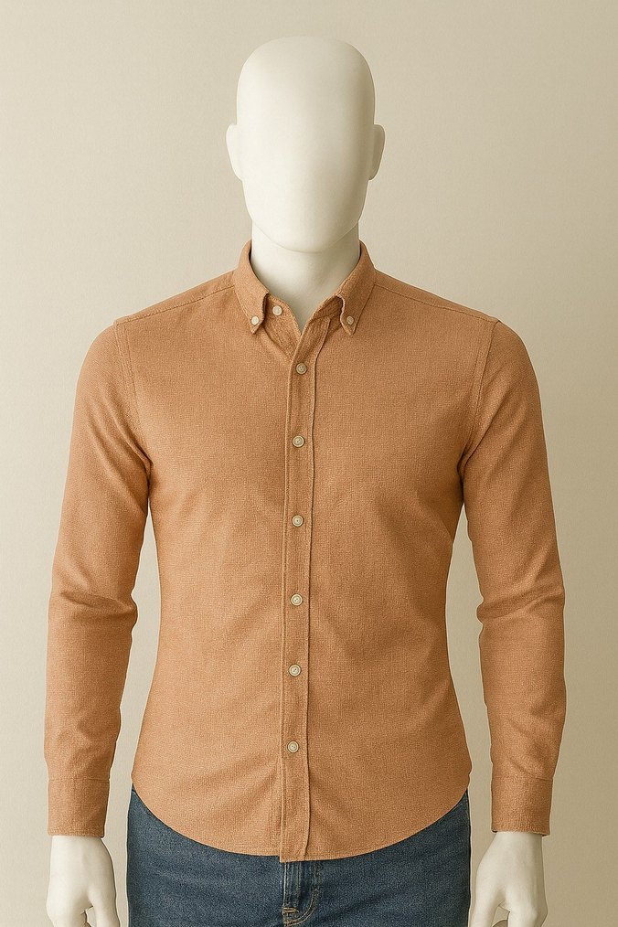 Bej renkte, düğmeli ve yakalı erkek gömleği. Yumuşak süet kumaştan, uzun kollu ve regular fit. Günlük kullanım için uygun, pastel tonlarda ve deseniz.