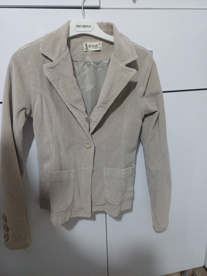 Bej süet kumaştan, düğmeli ve kesik yakalı kadın blazer. Uzun kollu, kısa boy ve rahat kesim, ofis ve günlük kullanıma uygun.
