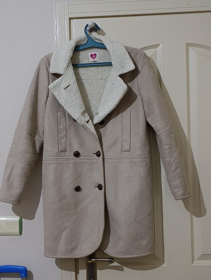 Bej süet düğmeli ceket, yumuşak iç astarlı, uzun kollu ve normal boydadır. Rahat kesimiyle günlük sokak stiline uygundur.