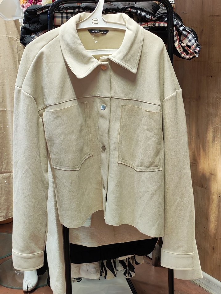 Bej renkte, süet kumaştan yapılmış, düğmeli ve uzun kollu kadın ceket. Normal midi boyda, rahat kesimiyle günlük sokak stili için uygundur.