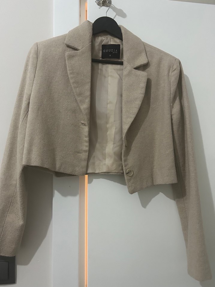 Bej süet kumaştan yapılmış, düğmeli ve normal boyda, uzun kollu, yakalı, sade kadın ceket. Ofis ve günlük kombinlere uygun, şık ve trend bir parça.