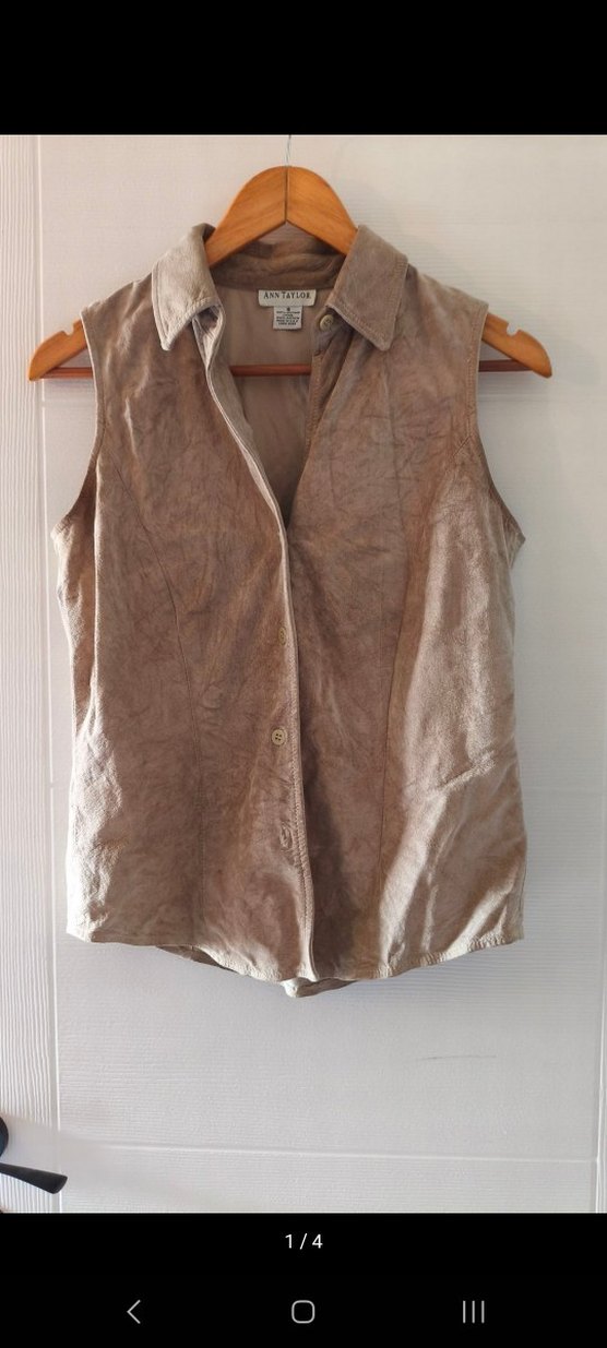 Bej renkte, süet kumaştan, düğmeli ve yakalı kadın yelek. Bohem tarzda, günlük kullanıma uygun.