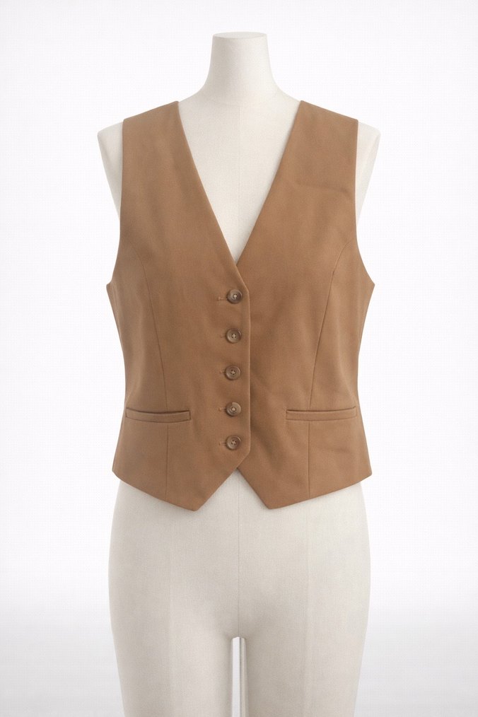 Bej süet kumaştan, düğmeli, kolsuz ve yakalı kadın yelek. Normal midi boy ve rahat kesimlidir, ofis kullanımı için uygundur.